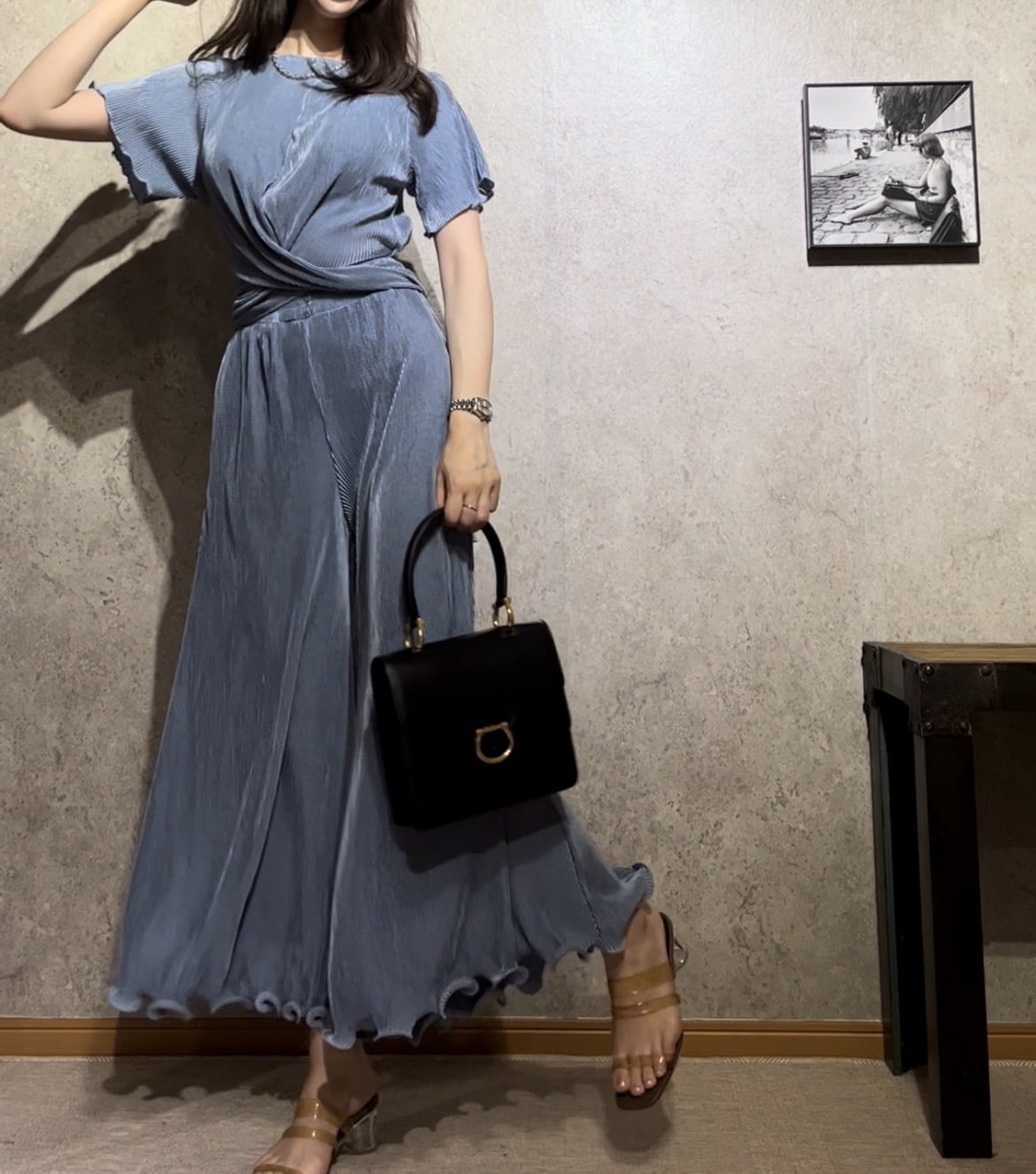 セットアップ/プラスサイズ/大きいサイズ/ワイドパンツ/着痩せ/旅行コーデ/お出かけコーデ/ディナーコーデ/秋コーデ/冬コーデ/春コーデ/夏コーデ/トップスパンツセット/ブラック/ブルーグレー/伸縮性素材/光沢感/エレガント/レディースファッション/ゆったり服