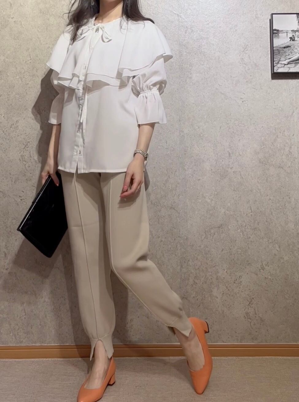 甘さを抑えたいときは、パンツスタイルでカジュアルダウンするのも◎