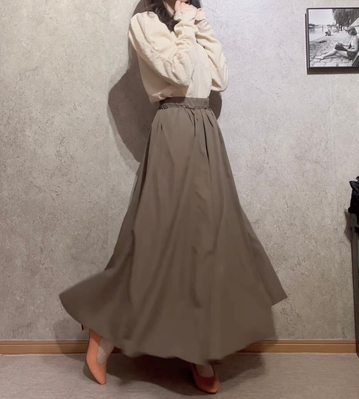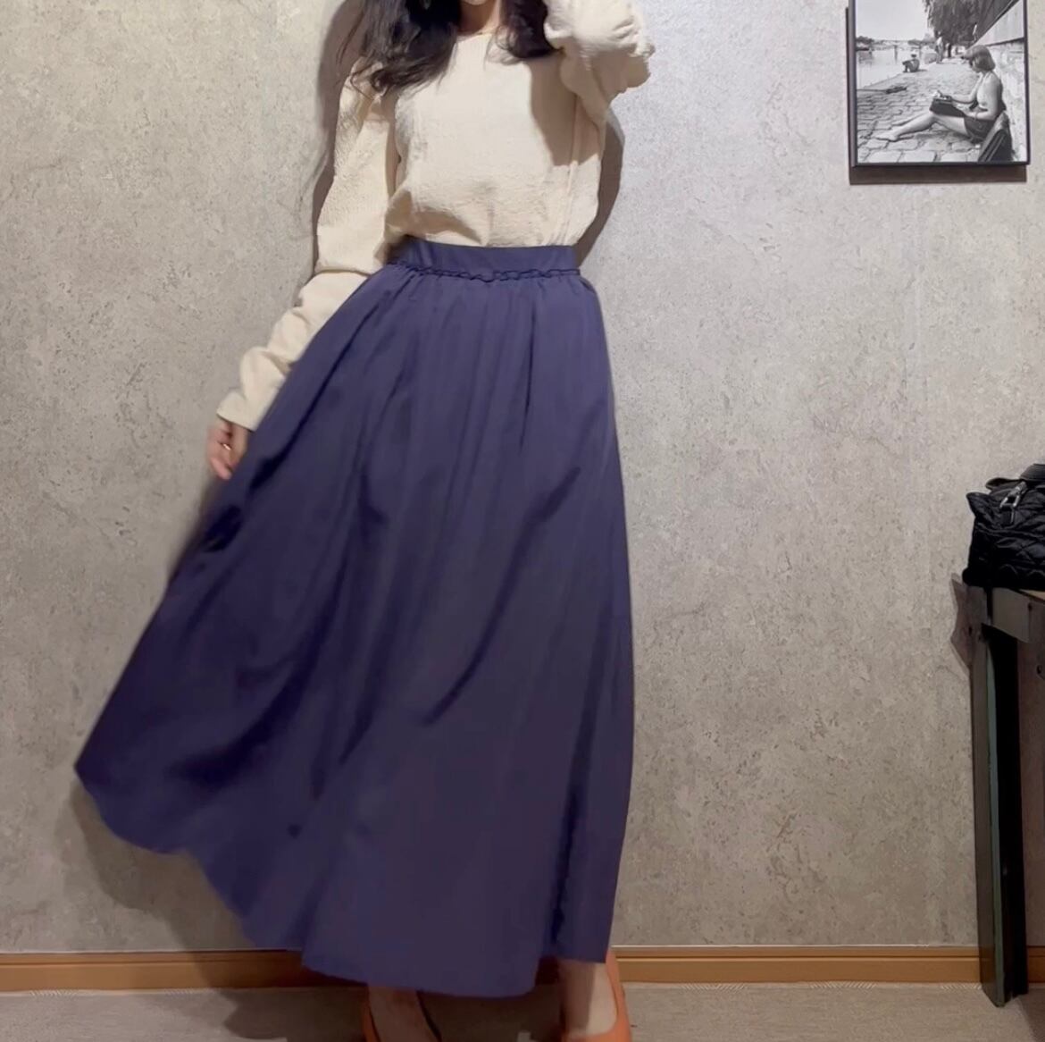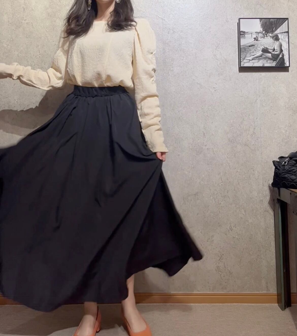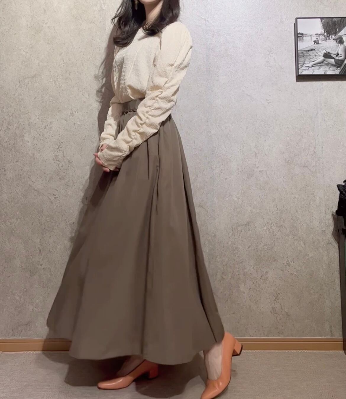 たっぷりの素材を使ったボリュームスカートは、ナイロン素材で甘くなりすぎないアイテムに。