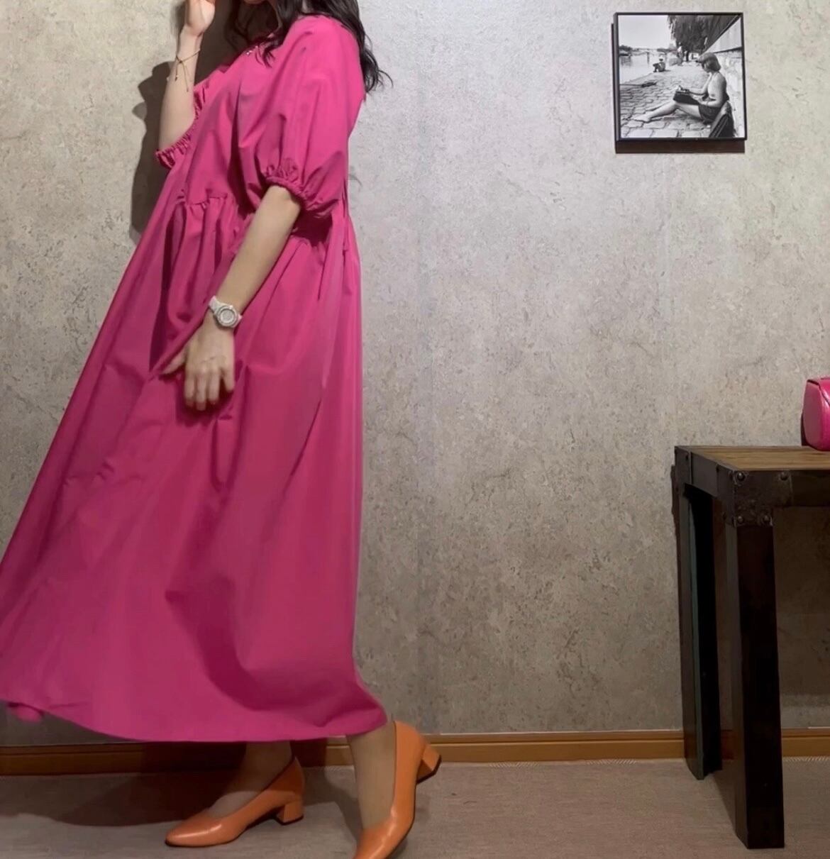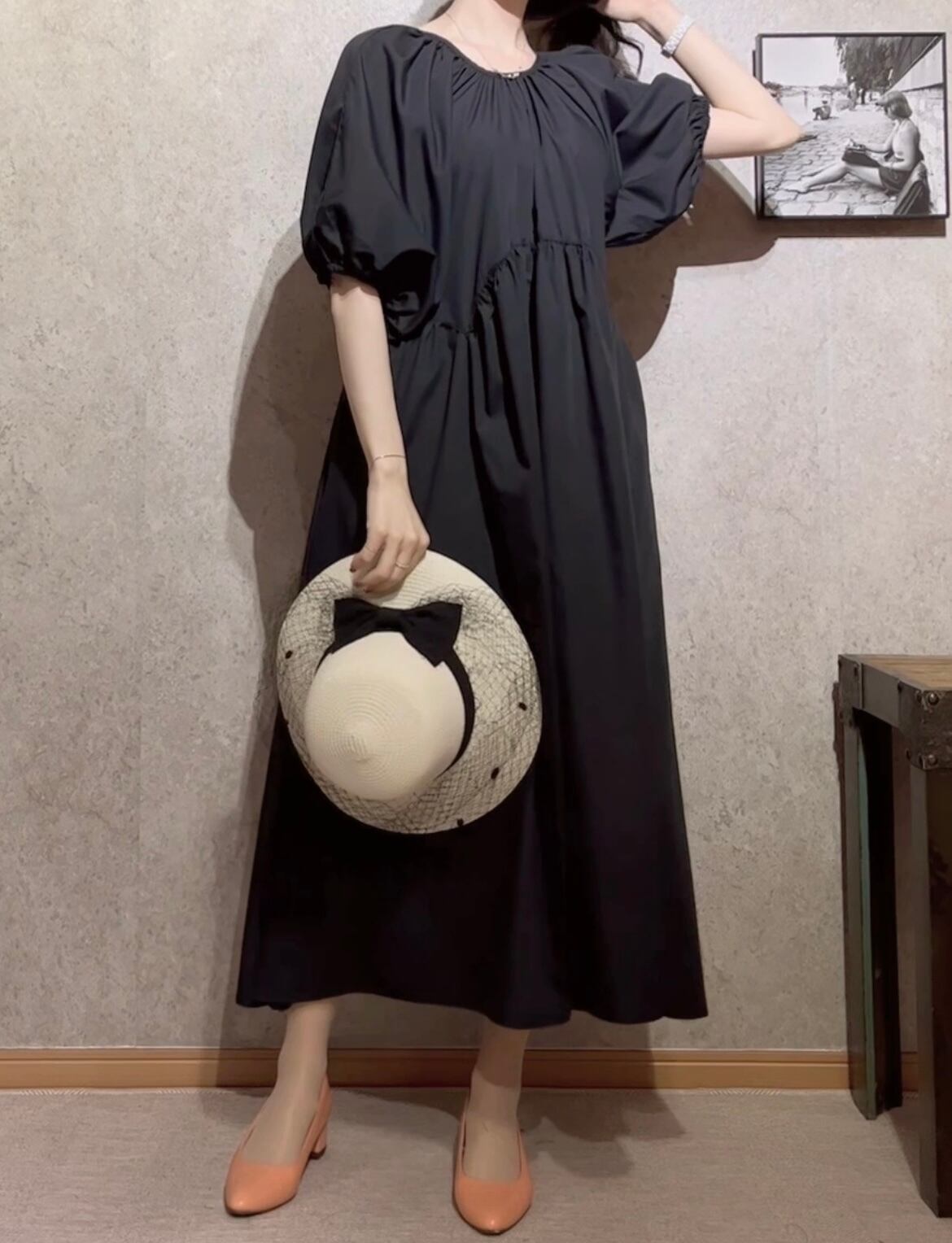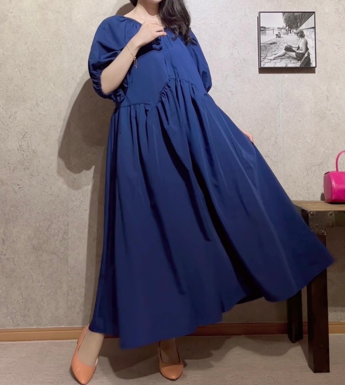 長めの袖で気になる二の腕、ギャザー でウエスト周りをフワッと見せてやんわりカバー!