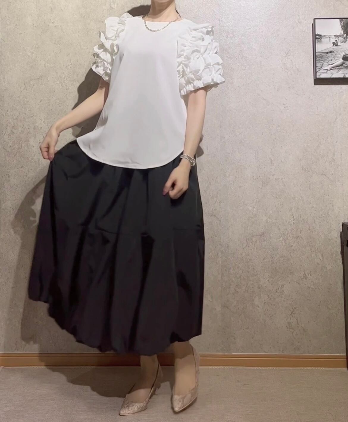 袖に施されたフリルがふんわり二の腕カバー。