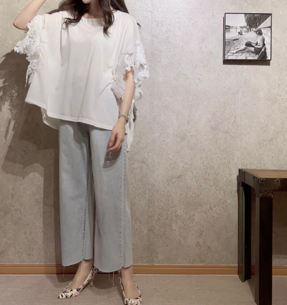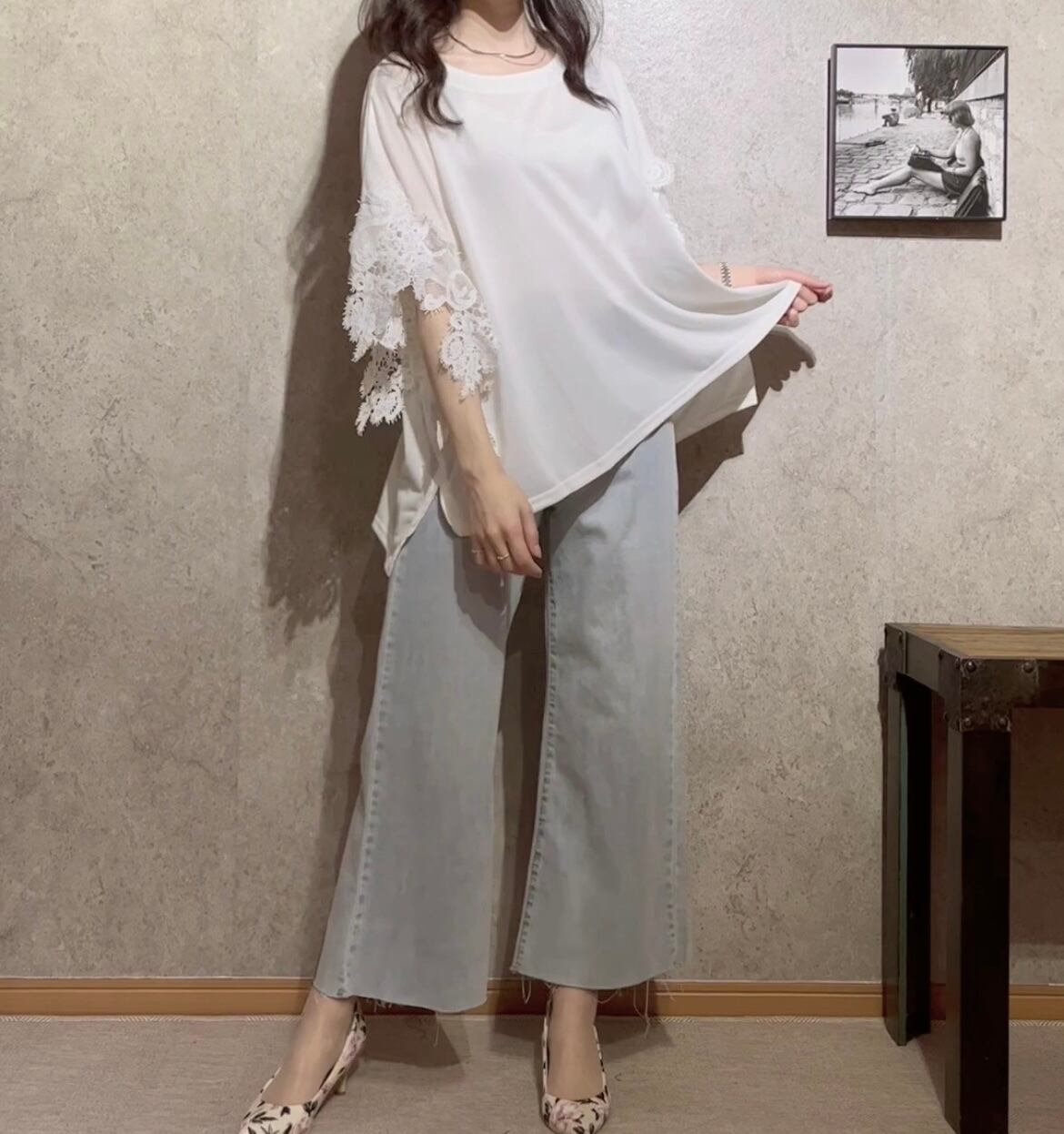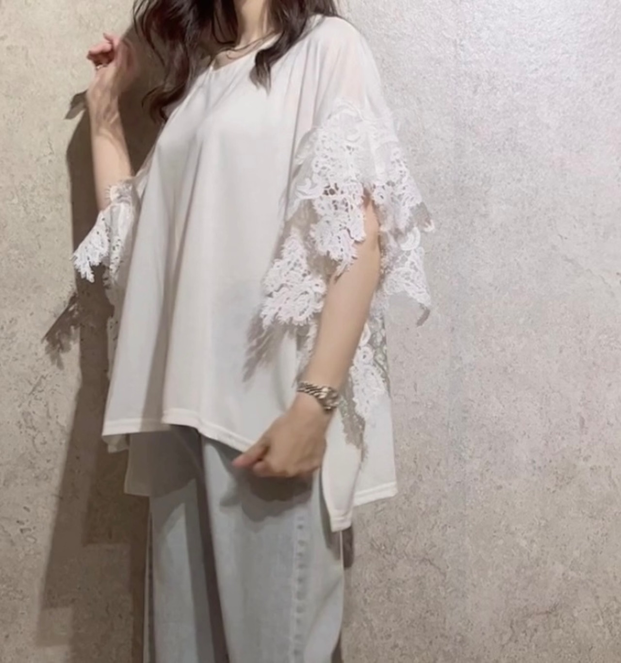 レースの袖が女性らしさを引き立てる、ゆったりとしたデザインのトップス