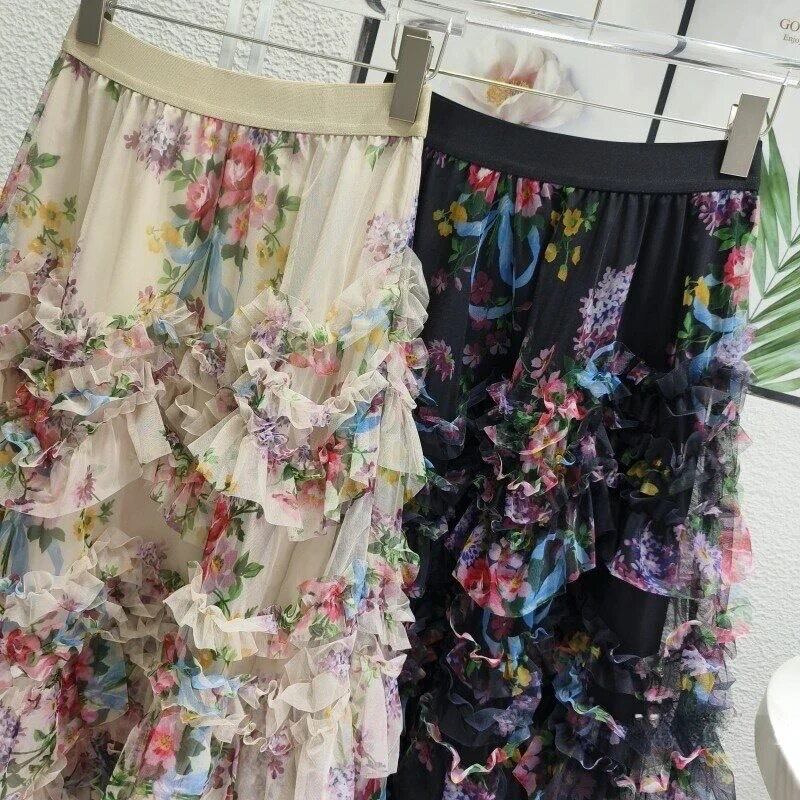 新作♡2色フラワーティアード チュールフリル ロング ミモレ スカート ウエストゴムフレア 軽い 美脚 着痩せ フリーサイズ 高級