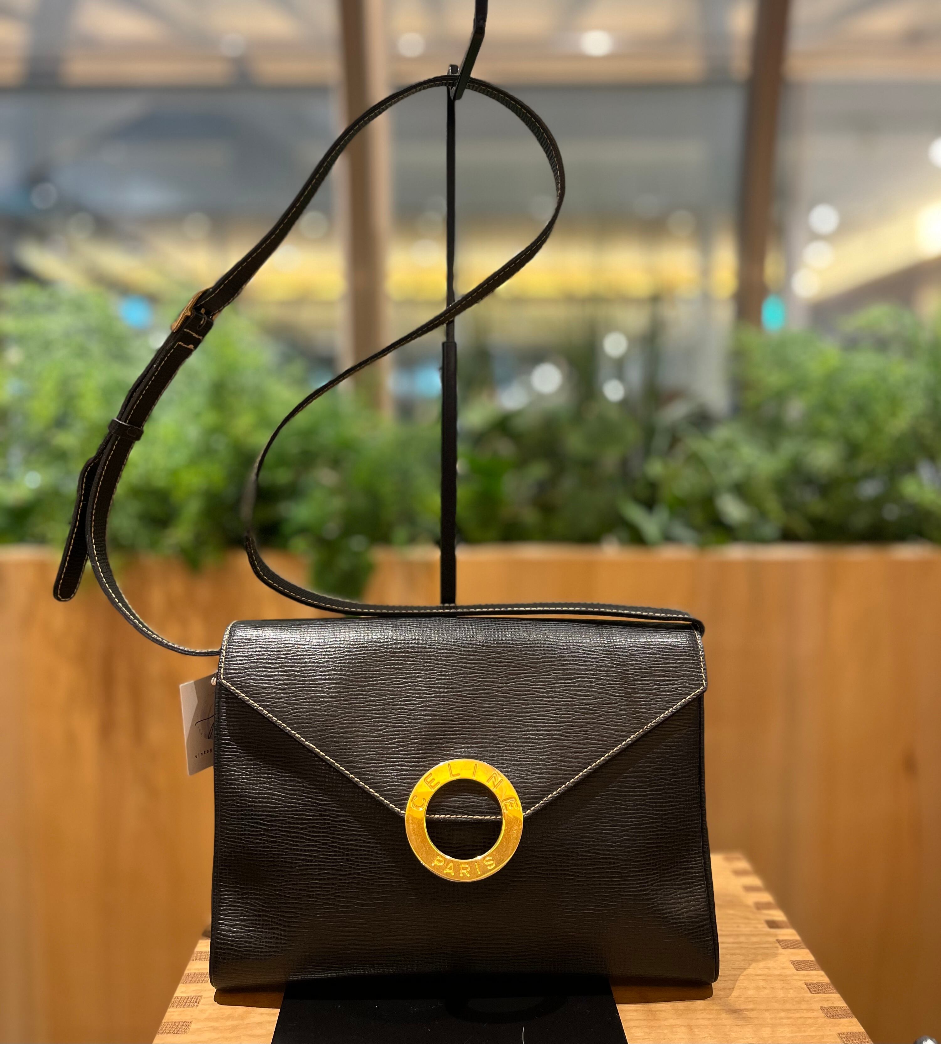 1. **ブランドとロゴ**:フロントの中央に「CELINE PARIS」と刻まれた金色のリングが目立ちます。このロゴは、セリーヌのアイコンであり、人気のヴィンテージアイテム特徴的なデザイン要素です。
