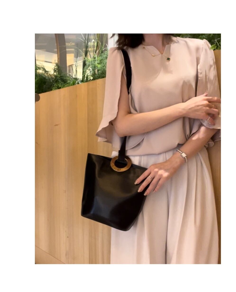 2. **素材とデザイン**:バッグの素材は上質なレザーで作られており、ブラックのカラーがシックでエレガントな印象を与えます。ストラップも同じ素材で作られており、調整可能なデザインになっています。
