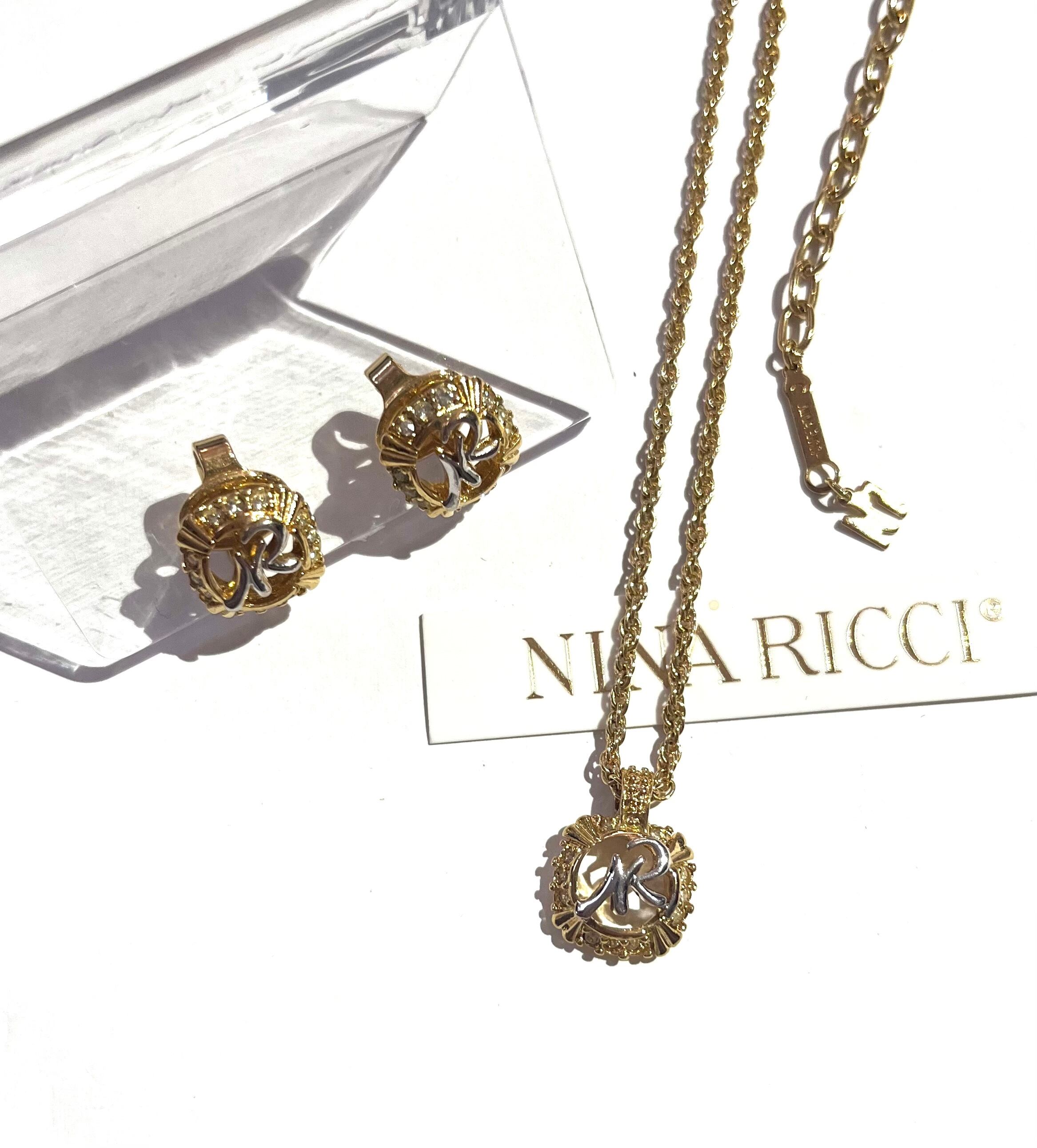 1379VINTAGE NINARICCI ネックレス&イヤリングsetストーンバイカラーニナリッチ フラワー ストーンイヤリング ブライダル結婚式アンティーク ヴィンテージ 90年代