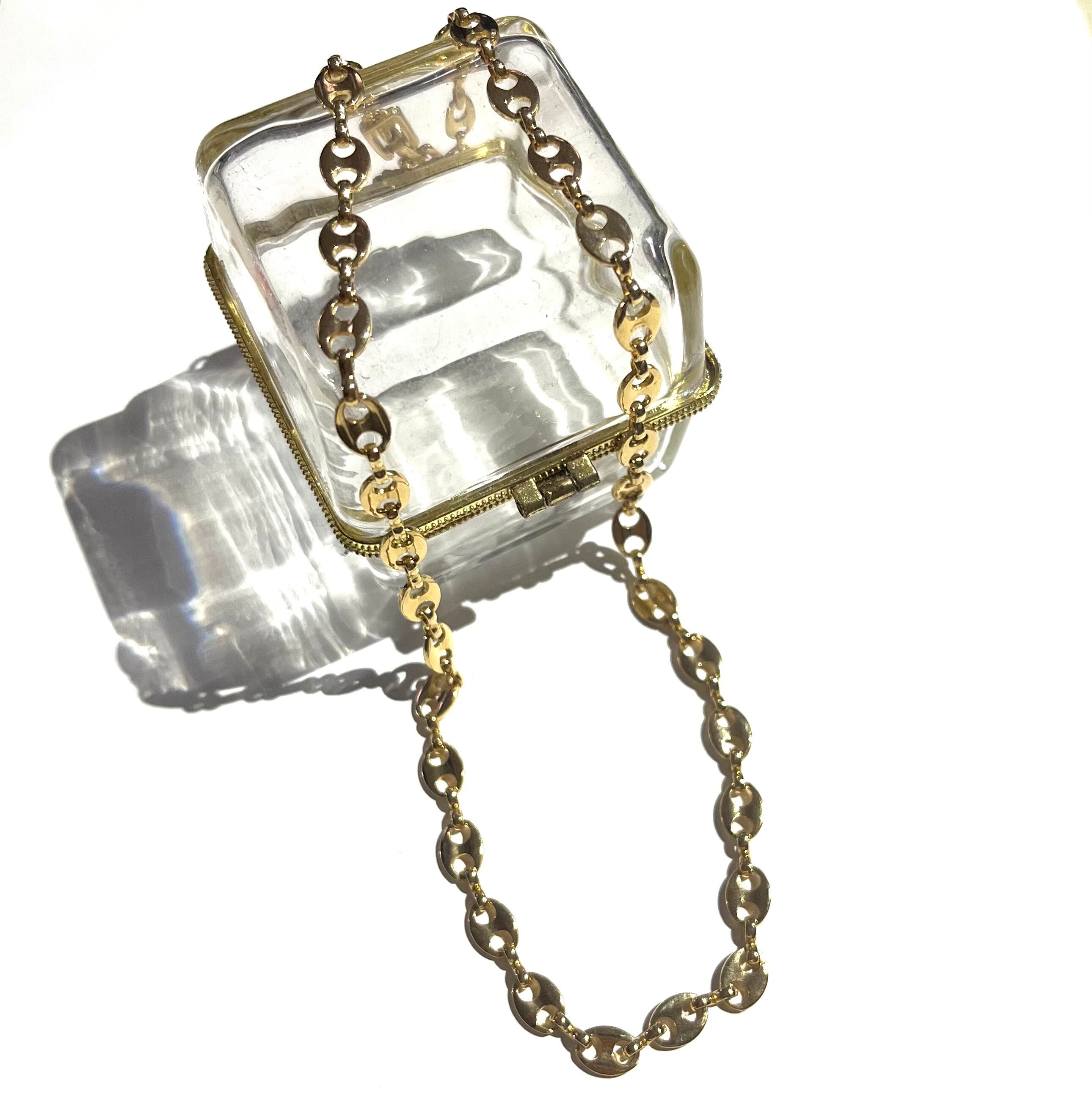 艶やかなゴールドにぷっくりとしたマリンチェーンがデコルテを綺麗に見せてくれるチェーンのデザインネックレスです。