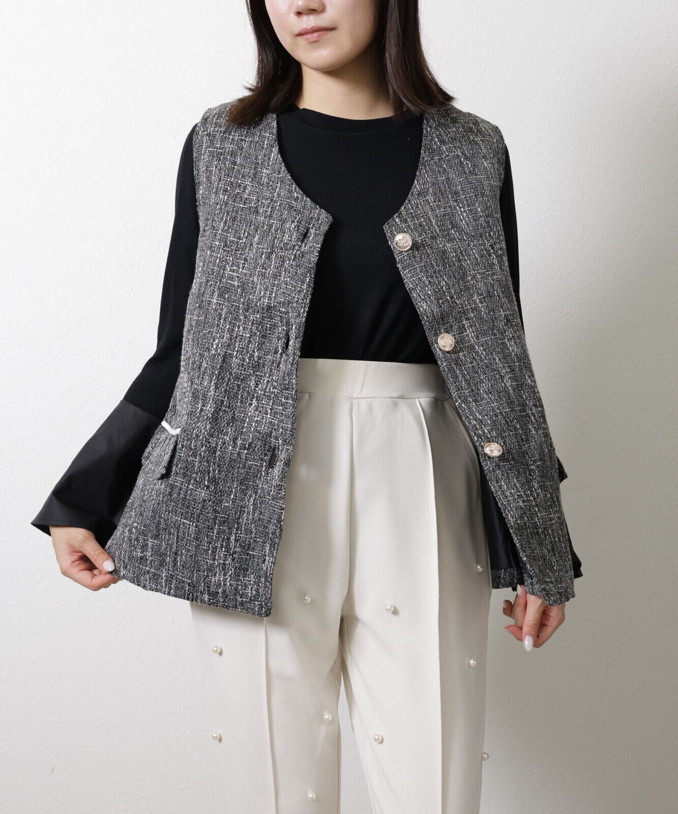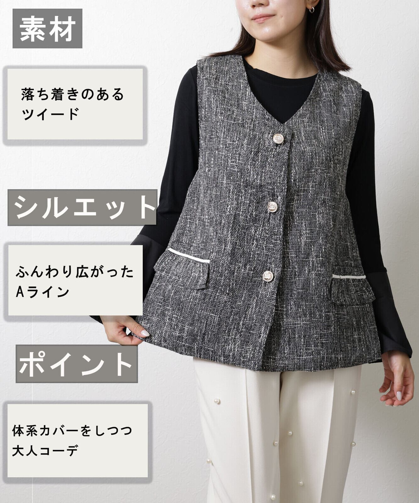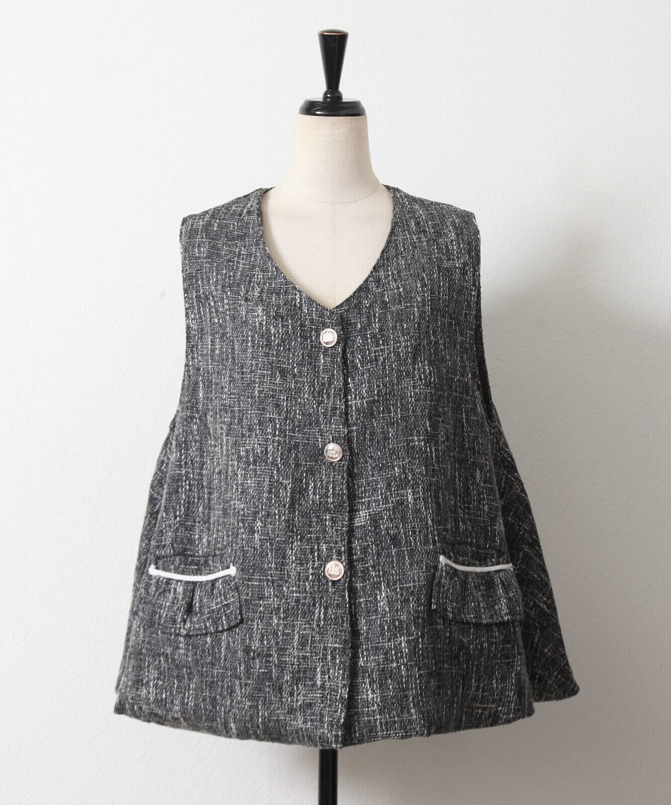 秋冬らしい素材、ツイード生地のベスト